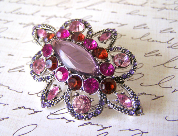 Vintage Monet Signed Silver Tone Marcasite Purple Pink Rhinestone Brooch